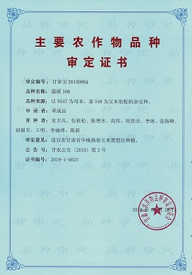 主要農(nóng)作物審定證書-強(qiáng)碩168(甘肅)