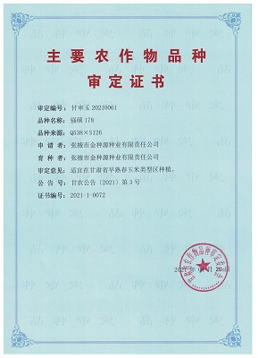 主要農(nóng)作物審定證書-強(qiáng)碩178(甘肅)