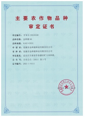 主要農(nóng)作物審定證書-金種源66(甘肅)